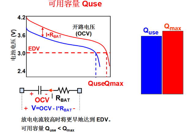 鋰電池的容量中還有一個(gè)對(duì)應(yīng)的容量就是可用容量,可用容量實(shí)際上也許只用了80-90%!因?yàn)閯偛胖v的是電池的化學(xué)容量,鋰電池的化學(xué)容量是在電流很小的時(shí)候測(cè)得的容量,它更多的是由電池本身的特性決定的。那實(shí)際在電池的使用過(guò)程中,這么多容量不是都能夠放得出來(lái)的,在實(shí)際的使用過(guò)程中,由于有一定的放電電流,所以放電曲線會(huì)比開(kāi)路電壓曲線低,大家可以看到這條曲線,由于存在電池的內(nèi)阻,實(shí)際的放電曲線是藍(lán)色的這條曲線,由藍(lán)色的曲線和紅色的曲線對(duì)應(yīng)的值得到Quse,Quse實(shí)際指的是電池的可用容量,在這張曲線中我們發(fā)現(xiàn),由于電池內(nèi)阻的存在使這個(gè)曲線的位置往下移了,那么放電的時(shí)候會(huì)更早的達(dá)到放電終止電壓,也就是更早的達(dá)到EDV,所以Quse一般是小于Qmax。