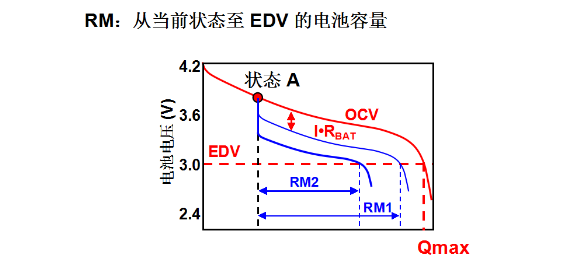 下面介紹的是電池的剩余容量。剩余容量是指當(dāng)前狀態(tài)放到EDV的電池容量,EDV也就是終止放電電壓。圖中當(dāng)前狀態(tài)A在一個(gè)給定的電流下進(jìn)行放電,放電到3.0V的時(shí)候,對(duì)應(yīng)的剩余容量從圖中標(biāo)出的就是R1。那如果在狀態(tài)A的情況下,同比較大的電流放電,這個(gè)時(shí)候這個(gè)曲線的位置會(huì)比開(kāi)路電壓更低一點(diǎn),也會(huì)比剛才的小電流放電的RM1對(duì)應(yīng)的位置更低一點(diǎn),那這個(gè)時(shí)候得到的剩余容量是RM2。RM2和RM1對(duì)應(yīng)的放電曲線它們的區(qū)別在于使用的放電電流是不一樣的,放電電流越大,曲線的位置越低,剩余容量就越小,所以電池的剩余容量是與放電速率有關(guān)的,不同的電流下面電池的剩余容量是不一樣的。有的用戶在電池的實(shí)際使用過(guò)程中在放電的情況下,會(huì)發(fā)現(xiàn)電池的容量由少變多,他感到不可理解,實(shí)際這里可以解釋一下,這種情況是由于放電電流的變化造成的,當(dāng)我們看到電池容量由少變多的情況,這個(gè)通常是由于放電電流突然變小造成的,因?yàn)樵诓煌碾娏飨码姵乜梢苑懦龅娜萘渴遣灰粯拥?,?dāng)放電電流變小的時(shí)候,它可以放出的容量是可以增加的。