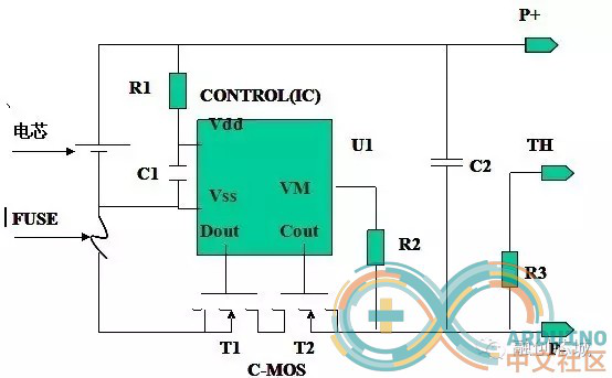 U1:控制IC;保護板所有功能都是IC通過監(jiān)視連接在VDD-VSS間的電壓差及VM-VSS間的電壓差而控制C-MOS執(zhí)行開關動作來實現(xiàn)的。