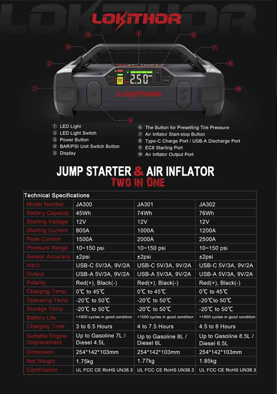 以上三種點火器都是JA產(chǎn)品,“JA”中的“J”代表跳躍啟動器,而“A”代表充氣器。這三個產(chǎn)品可以滿足不同的規(guī)格要求,參數(shù)可以參考下面的圖片(當然,來到現(xiàn)場近距離了解,會有更好更多的美好體驗)。